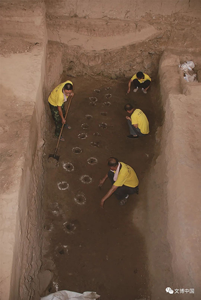 目前已探明储粮仓窖90多座,皆口大底小,圆形;口径8~14米左右,深约2.5~5米。仓窖排列基本整齐有序,排与排间距10米左右,窖与窖间距3.5~10米。其中C6窖口直径约12米,窖口至窖底深3.2米;窖口周围清理出有柱础遗迹。经过对窖内近底部残存的粮食遗存初步检测分析,为带颖壳的粟、黍及豆等。