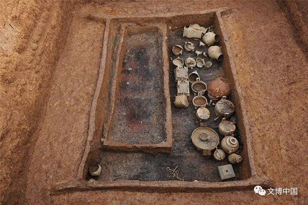 本次共发掘东周墓葬54座,其中土坑墓54座、车马坑2座、马坑1座,共57个单位。土坑墓皆为长方形或方形,大部分为东西向。按墓坑规模可为分大中小三类,其中大型墓7座(长度在5米以上),中型墓8座(长度在4米左右),其余皆为小型墓葬。坑内填土皆为黄红色五花土,土质板结、未见夯筑。在3座大型墓葬中发现有腰坑,坑内或葬狗,或葬陶器。