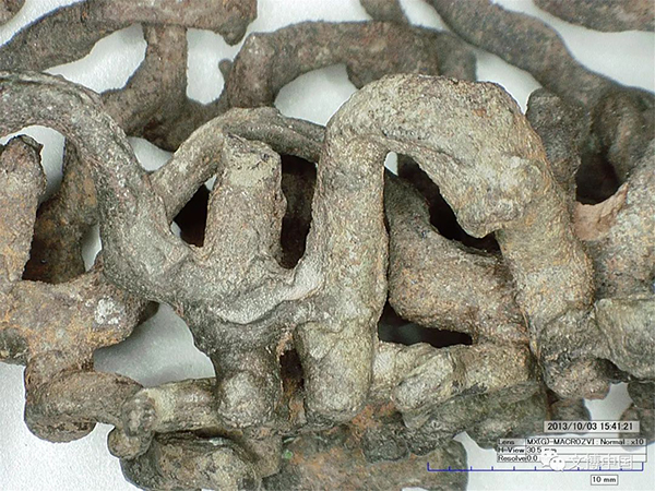 五、首次新发现了春秋中晚期曾国青铜器失蜡法铸造的直接证据。在M33出土的一件青铜盘的铜梗上发现了众多清楚的蜡流痕迹,这一不可颠覆的新发现,使得纷争不已的失蜡法铸造法有了一个定说。