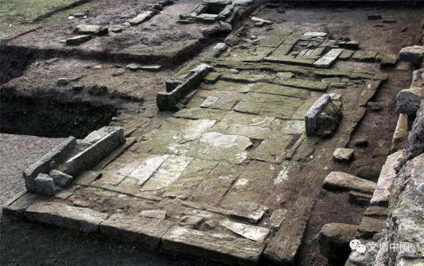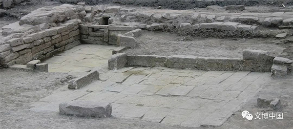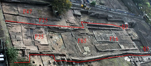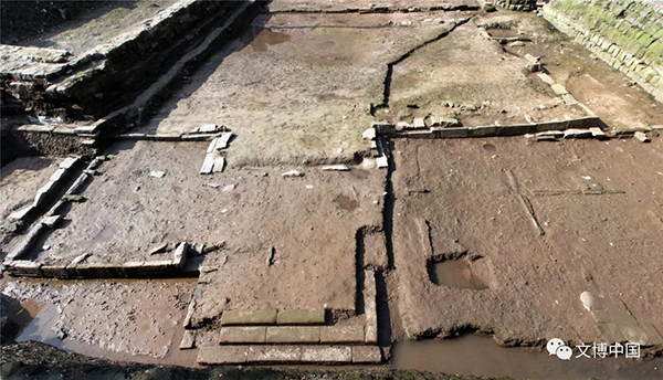 宋元遗迹58个。其中,位于Ⅰ区南部的夯土包砖式高台建筑(F1)是最为重要的发现之一。已揭露部分平面略呈方形,南北残长24.3米,东西宽24.7米,护坡墙及条石基础残高近10米。筑墙砖上发现有“淳祐乙巳东窑城砖”“淳祐乙巳西窑城砖”等阴、阳模印纪年铭文。F1东、北侧发现有规模较大、结构规整的石构排水设施。西部发现有同时期的两座大型凸字形建筑基址。其中F54保存较好,并存在二次修建迹象。