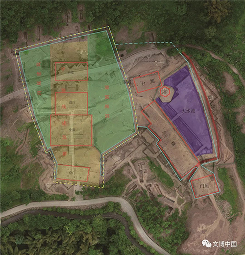 遗址分为办公区和园林区。办公区由围墙、中轴线建筑群、附属建筑三部分组成;园林区以大水池H1为中心,环绕分布有门屋、景亭、台榭、截洪沟、券顶涵洞等。