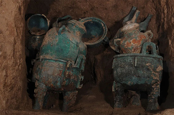墓向分南北向和东西向,多数墓室口小底大,墓底多有熟土“二层台”,个别为生土二层台;中型墓还有数量不等的壁龛。木质葬具,或一棺、或一椁一棺、或一椁两棺。葬式可辨者均为仰身直肢,墓主头朝地势较高的方位,即朝向台地中脊。小型墓大多于头端二层台上随葬一、两件陶器,或单鬲、单罐、或1鬲1罐,少见青铜器。随葬陶鬲以高领袋足鬲为主。而本次发掘备受关注的两座中型墓(M3、M4),随葬品种类丰富,数量多,尤以铜礼器为最,多出于壁龛内。