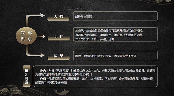 第一单元“乱世浮沉·以待天时”分为“创业时艰”和“隆中耕读”两组,呈现了群雄割据背景下,刘备屡败屡起的创业精神和诸葛亮躬耕陇亩,以待天时的少年壮志;第二单元“君臣共济·蜀汉立国”分为“君臣际会”“武担称帝”“白帝托孤”三组,讲述了在诸葛亮的辅佐下,刘备广揽名士、开疆扩土,终成一番霸业,但折戟夷陵,弥留之际将江山社稷悉数托付于诸葛亮;第三单元“兴复汉室·鞠躬尽瘁”分为“开府治蜀”“安抚南中”“北伐曹魏”“诸葛奇思”“星落五丈原”五组,叙述了蜀汉新主幼弱之际,诸葛亮总理朝政,竭股肱之力,效忠贞之节,终致积劳成疾,病逝于五丈原。