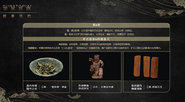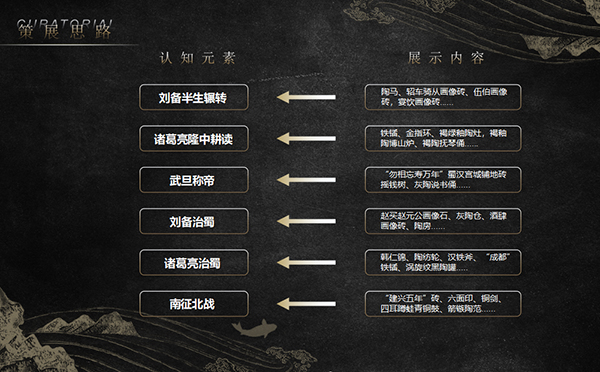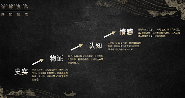 在创建观展体验初期,利用设计思维(design thinking)在物的剧场中共同创造“与众不同”的沉浸式剧场展示空间,以物为主角讲故事,提供观点并创造真实感知,激发观众去往记忆烙印中的历史时空。通过对历史发展中的闪光点进行提炼性呈现,营造出更具亲切观感的观展氛围,来充分挖掘三国文化核心价值。