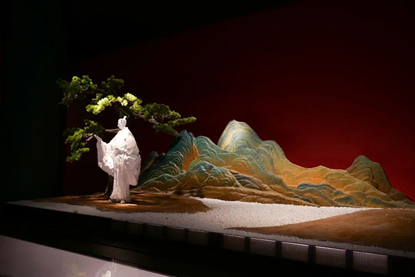 展览开创了古典建筑与现代展陈深度融合的全新模式,采用红色与蓝色色调,同时巧妙地结合自然光线,让展厅中呈现出光影叠现、错落有致的效果。将厚重的历史与明朗的园冶融入展览空间当中,观众站在室内,光影的明暗,构成空间的审美秩序对比,加深空间的沉浸性,或伴随着原创的汉调古曲沉醉于当时,或面对着光影雕塑遐想片刻,都能徜徉其中,感受宏大历史叙事的微观表达和诗意呈现,体味君臣之鱼水深情。