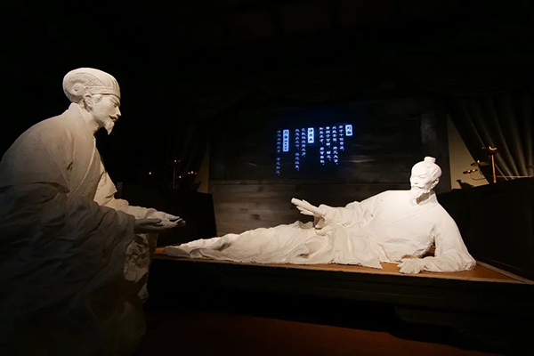 历史场景复原的展示,通过背景的布置、人物的互动与装置物的陈设,多维度地传递历史信息,使观众身临其境,充分在展厅中获得丰富且多层次的观展体验。行至白帝托孤场景式展项,刘备卧于病榻一侧,诸葛亮表情凝重,近侍以听召,配以该展项处偏昏暗又聚焦人物的灯光效果,刘备东征失败一病不起,交待诸葛亮身后之事的悔恨、遗憾和不舍,诸葛亮面对旧主病逝的痛楚和不安便清晰地表现出来。