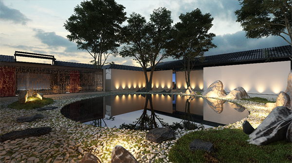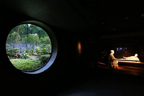 在策划中充分考虑博物馆建筑美学、园林景观与展陈空间设计的多样性,深层次沁入与互融。展厅中央设计了中庭式园林景观,展厅以同心圆为轴,使蜀汉历史与川派园林产生更为深度的绑定。园林布局以水池为中心,高低错落的英德石分布周围,点植苍松、古槐、石竹其中,配以蜀葵、杜鹃,以大花蕙兰扣题,山池花木之成景为主调。展厅分区均衡、节奏疏密有致,路线无交叉、无回转。在展厅一侧始终保持开窗透景,将室外景色引进室内,自然光、人为光共同构建空间律动,打造一个简明精巧的多位艺术空间。值得一提的是,在归葬惠陵展项中,多媒体与实景相结合,采用开窗透景直望惠陵的展陈手法,为观众提供全新的“园展交互”观展体验。