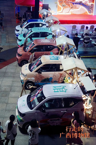 2022年9月23日晚,由我馆和五菱汽车联合举办的“行走的广西博物馆”项目启动仪式暨后备箱博物馆集市活动在南宁市兴宁区印象城中心广场举行。在启动仪式的现场,“行走的广西博物馆”主题改装车首次集中亮相。主题车风格各异,意涵丰富,设计灵感来源于我馆改扩建后即将推出的全新八大主题展览。其中一辆特别的文物主题车曾亮相第九届“中国博物馆及相关产品与技术博览会”,车身纹样提取自羽纹铜凤灯、翔鹭纹铜鼓、商兽面纹提梁铜卣等三件我馆馆藏珍贵文物,吸引了众多观众的目光。