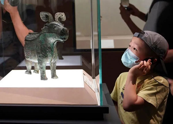小朋友在上海博物馆举行的“宅兹中国——河南夏商周三代文明展”上参观(2022年7月30日摄)。