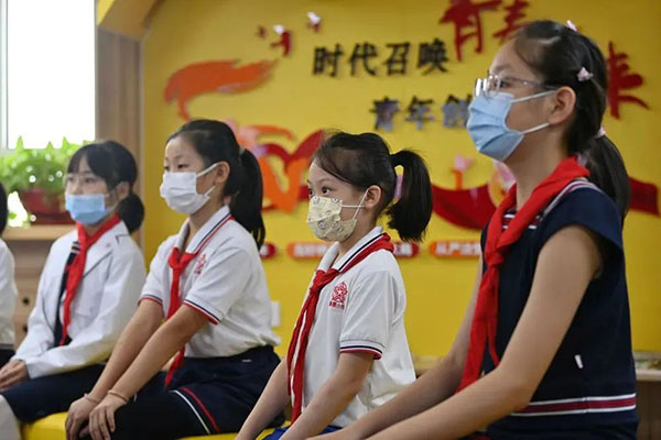天津市和平区新星小学学生在观看电影《我和我的祖国》(2021年9月28日摄)。