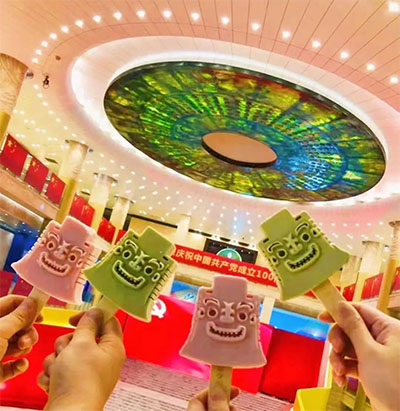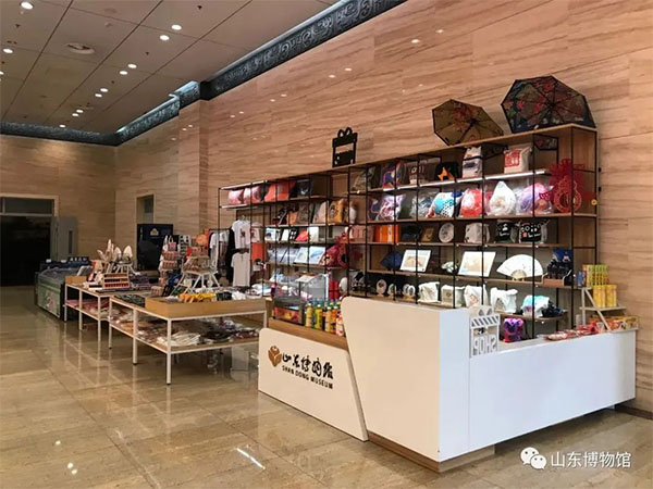 山东博物馆二楼、三楼、四楼文创商品专柜内,众多文创产品琳琅满目。各种根据馆内服饰、馆藏文物元素设计的产品,既颇具新意,又能让传统文化符号“破圈”。例如备受观众们喜爱的山东博物馆的“网红”文物、十大镇馆之宝之一的亚丑钺,因为其近似憨厚呆萌的人脸外形,深受广大观众的喜爱,于是山东博物馆进而开发了亚醜钺雪糕、亚醜钺巧克力等文创美食,以及书签、帆布包、尺子等生活用品,进一步丰富了博物馆的文创产品。