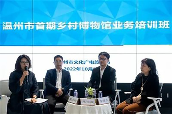 在当天的培训会上,浙江大学经济学院特聘金牌讲师(杭州旅游协会乡村文旅分会副会长)胡方晓、温州商学院产品设计教研室主任孙伦作为授课老师,洞头贝雕博物馆馆长陈灿渊、浙江博物馆公共服务平台运营商李惊天作为对话沙龙嘉宾,永嘉县瓯忆文化博物馆副馆长姜立秋、瑞安市东梨民艺博物馆馆长徐夏怡、洞头区海陶艺术馆馆长林公佐则作为案例分享嘉宾,均通过乡村“文化”、乡村“手艺”、乡村“味道”、乡村“记忆” 、乡村“特产”、乡村“文创”等各个方面,分享了建设民办博物馆的观点,并讲述了温州乡村博物馆建设路上的温暖故事。