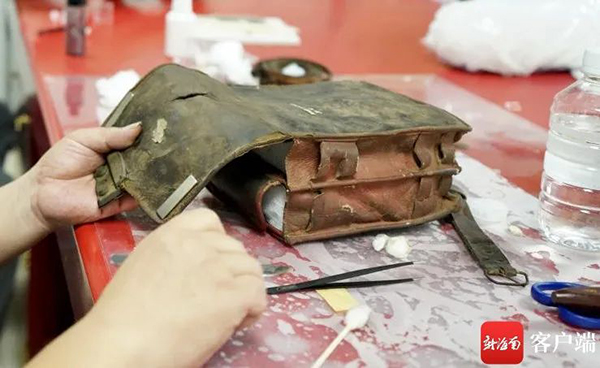 蒸馏水、酒精、甘油,这些在生活中都能用到的日化用品,经过科学配比也会用在修复皮革类文物的过程中。因酒精能溶解污染物,同时能软化皮革,通过适当添加甘油还能恢复皮革弹性,后续还有回软、定型、补配等工序。