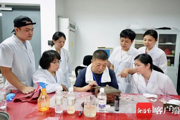 徐东良老师与文物修复人员就皮革文物修复的经验进行互相交流。海南省博物馆供图