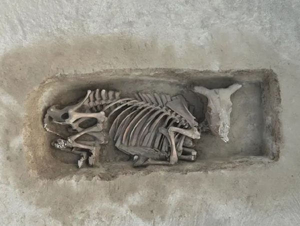 西木佛墓地还发现了保存完整的牛牲坑。“总共发现了10个殉牲坑,主要集中在墓地西侧,像这样如此集中发现殉牲坑的商周墓地比较少见。”李鹏为告诉记者,其中一个牛牲坑保存完整,从牛头到牛尾的骨骼比较齐全,它体长约两米,非常罕见。