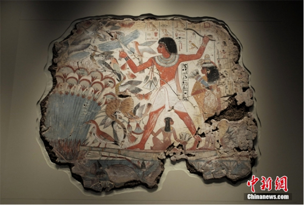 图为博物馆内古埃及文化的壁画绘画彩绘,展示了古代埃及文明的生活生产场景。