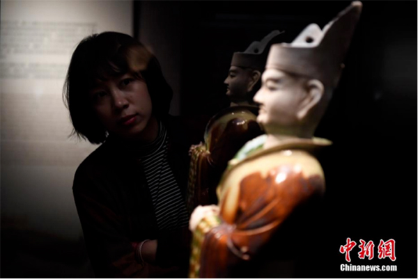 图为民众观看中国国家博物馆大英展中展出的三彩文官俑。