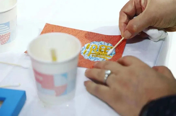 在宋庆龄纪念馆组织的接“福”手工互动体验活动中,工作人员指导嘉宾洒金接福,为文博文创展区的互动活动拉开序幕。