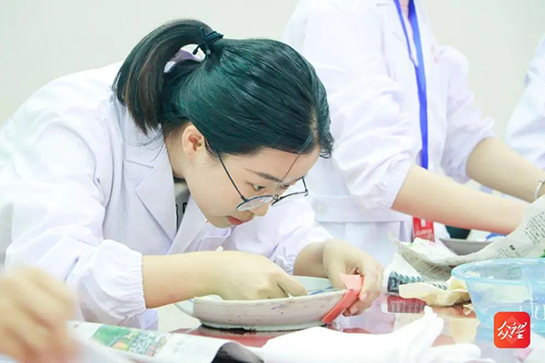 最后看修修补补的文物“整形”现场——陶瓷及青铜器文物修复项目:21名选手比的则是“缺者使完,危者使安”后的“完美,绝了”。