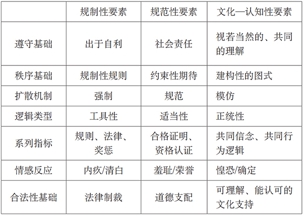 美国社会学家W·理查德·斯科特力求为“制度”下一个具有包容性的定义,提出一个覆盖广泛的理论框架,为此,他在著作《制度与组织(Institutions and Organizations)》(第4版)中提出了一套被广泛认可的制度理论“制度包括规制性、规范性和文化—认知性要素,这些要素为人们的社会生活提供各种资源,也为人们提供稳定性和意义,从而使人们得以开展各种活动。”[7]在这一定义中,规制性(regulative)、规范性(normative)和文化—认知性(cultural-cognitive)被确定为制度的三大核心要素,为特定社会行为提供具有弹性的结构框架,如此,方能确保制度既能发挥其强大制约力量,又可以进行柔性变化,在运行过程中始终保持稳定性和牢固性。