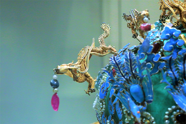 珠滴可以在走动的时候,象步摇那样随步摇晃。翠凤下有3排以红蓝宝石为中心的珠宝钿,其间点缀着翠兰花叶,冠檐底部有翠口圈,上嵌宝石珠花,后侧下部左右各饰点翠地嵌金龙珠滴三博鬓,博鬓上嵌镂空金龙,珠花璎珞,似金龙奔腾在翠云之上,翠凤展翅翱翔于珠宝花丛之中,金翠交辉,富丽堂阜。