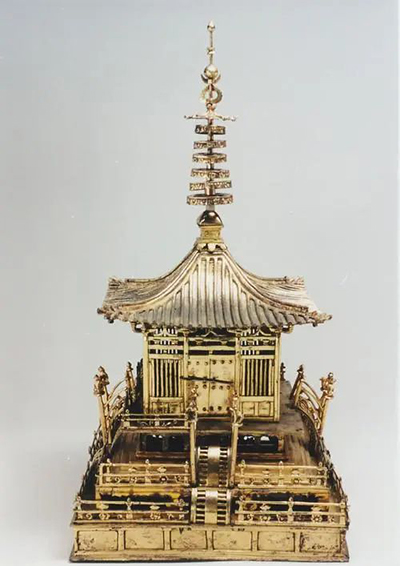 法门寺地宫内发现的唯一一枚真身灵骨,也是世界上至今唯一的佛教圣物放置于鎏金伽陵频迦鸟纹银棺的棺盖内,而这枚银棺则盛放于铜浮屠内。
