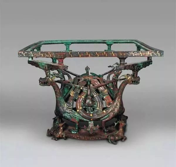 错金银四龙四凤铜方案座集铸造、镶嵌、焊接等多种工艺于一体,复杂精巧,无以复加。