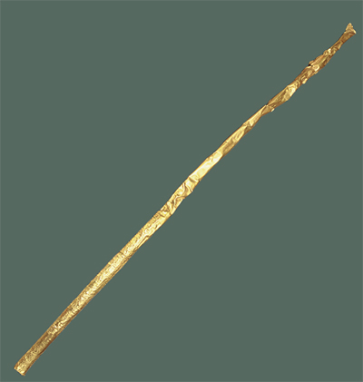 金杖根据长度和直径计算,它的金皮的展开面积为1026平方厘米。要知道,在几千年前,制作出这么大的金皮,锤制得如此平整,表面如此光滑,足以说明当时的人对黄金良好的延性和展性等物理性能已有了充分认识。