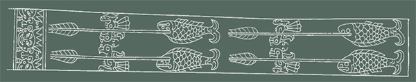 图案共分三组:靠近端头的一组,合拢看为两个前后对称,头戴五齿巫冠,耳饰三角形耳坠的人头像,笑容可掬。另外两组图案相同,其上下方分别皆是两背相对的鸟与鱼,在鸟的颈部和鱼的头部叠压着一支箭状物。