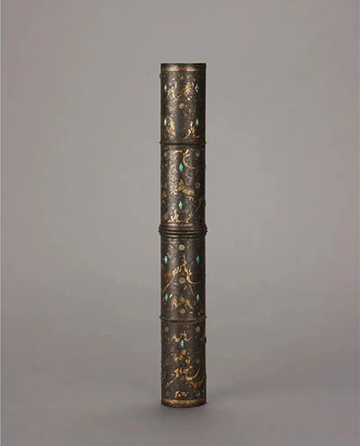 西汉错金银镶松石狩猎纹铜伞铤,繁复的纹饰显示了汉代错金银工艺的高度发达,其中所蕴含的升仙思想(羽人、飞马、神兽等组合形象)以及对仙境的描绘,都表现出汉人对死后灵魂飞升的极度渴望,和对心目中仙境的无限向往。