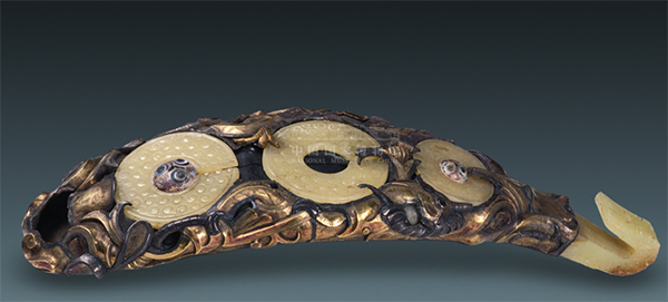 战国时期是带钩使用的高峰期,战国带钩工艺繁复,有鎏金、错金嵌玉带钩,也有纹饰精美的玉质带钩。这件带钩制作集多种工艺于一身,构思奇巧,装饰华美,具有战国带钩制作的工艺特征,反映出战国带钩高超的制作水平。