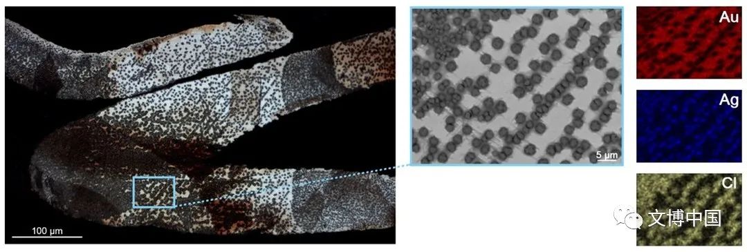 在上述背景下,本课题组以三星堆出土金器(Au85.43%-Ag 14.57%)为主要研究对象,以王水为待优化浸蚀剂,通过动力学控制实验研究不同稀释比例的王水浸蚀效果的差异。现已探明,王水浸蚀金器时,样品溶解产生的游离态Ag+离子,与浸蚀剂中的Cl-离子结合生成稳定的AgCl固体杂质覆盖在样品表面,此为使用王水浸蚀金器样品效果较差的主要原因。当使用纯王水进行浸蚀时,由于浸蚀剂浓度较高,初期的反应速度较快,大量的AgCl结晶核生成并形成泥沙样的“AgCl膜”覆盖在样品表面;当使用稀释比例较高的王水进行浸蚀时,由于浸蚀剂浓度较低,初期反应速度较慢,仅有较少的AgCl结晶核生成,随着反应的不断进行,结晶核生长为体积可辨的“AgCl颗粒”集聚在样品表面(图2)。通过改变王水的稀释比例可以有效控制AgCl杂质生成的形态,从而为后续有针对性的去除杂质打下基础。