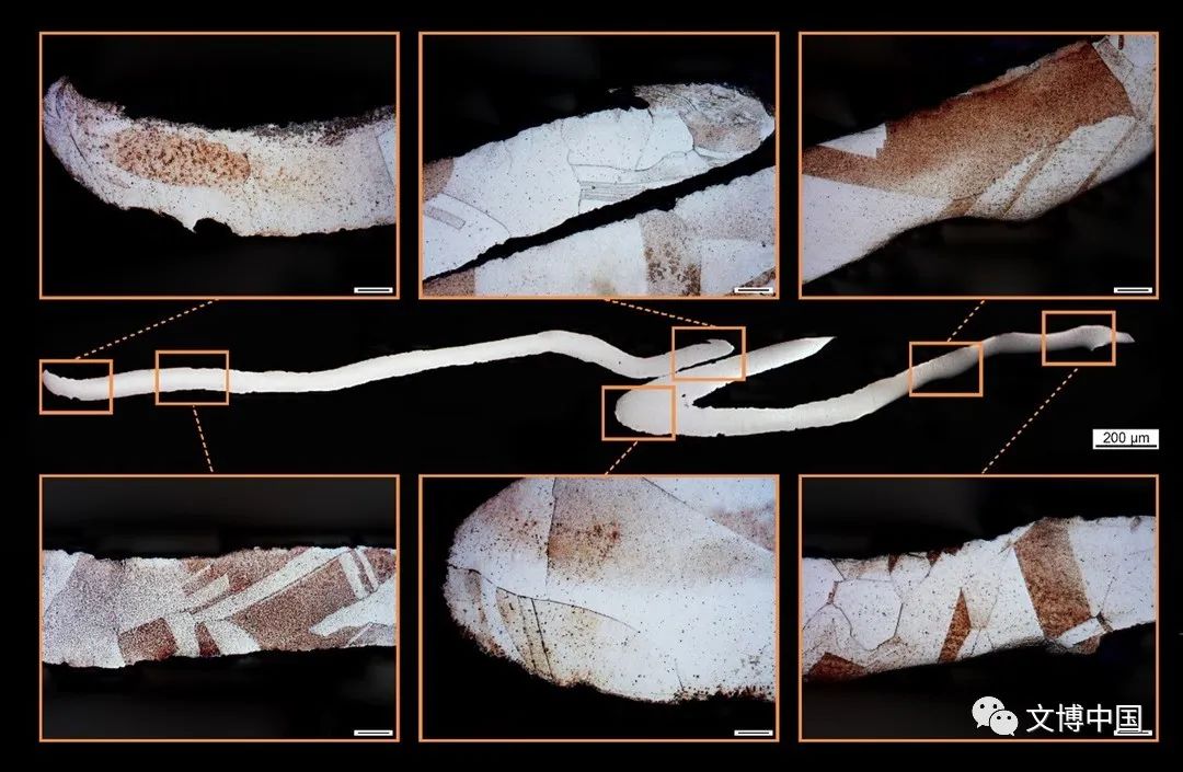 运用上述优化后的金器浸蚀方案,本课题组对一件三星堆出土金器样品进行了全面的金相信息获取,取得了很好的效果(图3)。