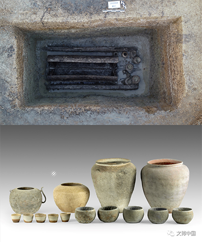 随葬清一色原始瓷器和印纹硬陶器的现象和采用“独木棺”的葬俗,均为长江下游地区吴越系墓葬的典型特征,据此我们推测其墓主人身份应为吴国或越国人。但采用竖穴土坑的结构、一棺一椁的葬制和普遍使用“青膏泥”的情况则说明其应该吸收了较多的楚文化因素。