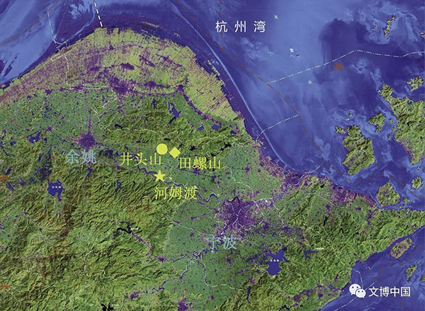 井头山遗址与河姆渡遗址、田螺山遗址的相对位置