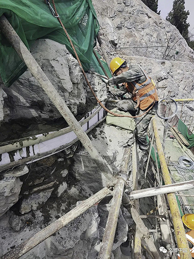 二是危岩体加固,对奉先寺区域较大危岩体采用锚杆和圈梁加固,并设置被动防护网拦截落石;在奉先寺西坡、北坡和南坡岩体碎裂区域铺设主动防护网,防止小块岩石脱落。
