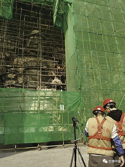 高度重视 理念创新 龙门石窟奉先寺渗漏水治理和危岩体加固保护工程是“十四五”开局的首个大型石窟寺保护工程,龙门石窟研究院党组高度重视。在工程准备阶段,史家珍院长组织设计方、监理方、施工方和石窟保护研究中心召开了四方会议:(1)业主、设计、监理和施工是一个团队,一荣俱荣,要求安全有序开展奉先寺保护工程,认真落实《“十四五”石窟寺保护利用专项规划》,将科研工作贯穿工程整个施工过程,齐心协力打造优质工程。(2)建立专家例会制度,聘请资深文物保护专家2至3人全程指导奉先寺保护工程,信息化施工,动态化设计,对工程中遇到的技术问题,工程变更等重大事项提出合理意见。(3)成立安全检查小组,进一步加强工程的安全生产、劳动保护、设备安全、文物安全等监督检查,聘请工程结构方面专家,对脚手架安全检查评估,根据专家意见及时整改,夯实安全防线。(4)增强文物保护工程公众参与度,邀请人大代表、政协委员、媒体及社会各界监督工程施工安全和文明施工。