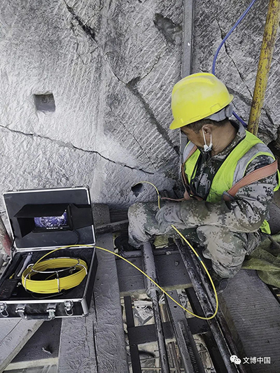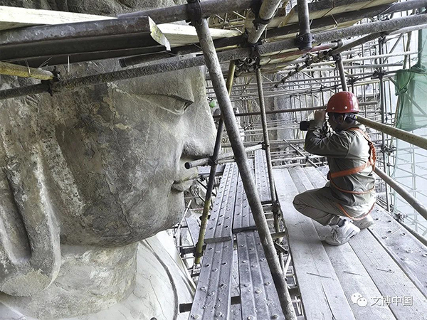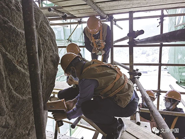 团队协作 加强科研 本次奉先寺保护工程是20世纪70年代对奉先寺实施抢救性保护工程以来的第二次大型保护工程,不涉及文物本体的保护修复。奉先寺保护工程施工期间,龙门石窟研究院联合上海大学、陕西省文物保护研究院、辽宁有色勘察研究院有限责任公司等多家科研单位组成科研团队,对奉先寺展开了详细而全面的病害调查评估与石窟寺考古工作。科研团队利用微波水分仪、X荧光光谱仪、拉曼光谱仪、红外成像仪、磁化率仪、笔氏硬度计、地质雷达及地震共振频率成像、超声波无损检测技术等高科技手段,探测分析了卢舍那大佛表层含水率、表面风化产物成分、不同时段佛身表面温度、佛身各部位磁化率、硬度、表层修补层厚度及佛身岩石完整性等表征文物本体客观存在状态的技术参数,取得较为详细的调查资料,全面评估奉先寺历史上的保护方法、材料和工艺,为龙门石窟文物科技保护提供借鉴。