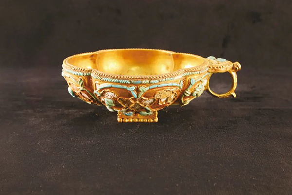 泉沟一号墓镶嵌绿松石四曲鋬指金杯