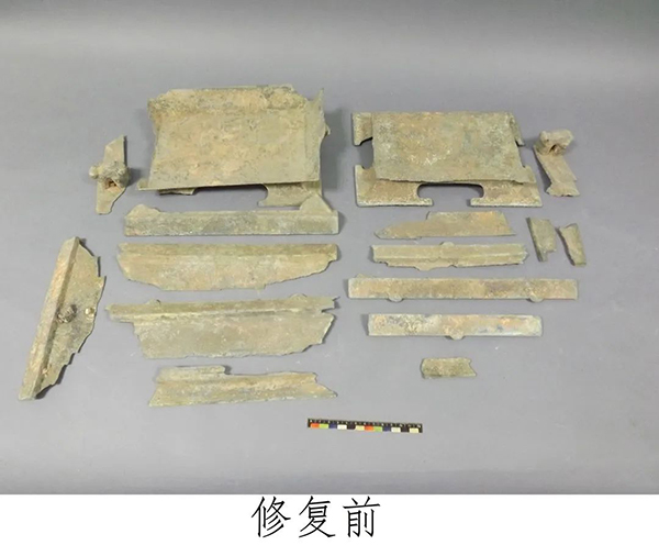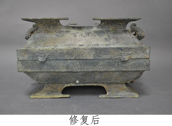 由于墓圹的塌陷,长期受到土壤中水、氧气、各种阴阳离子以及微生物等多种因素的侵蚀,导致铜簠出土时损伤特别严重。簠盖破碎成7块,簠身破碎成9块,每块都存在不同程度的变形、裂隙、残缺、孔洞、酥解。碴口及缝隙腐蚀严重,形成层次不齐的缺口。口沿部分严重矿化,锈蚀呈层状剥落。簠身曲尺圈足两处破碎并缺失,簠身两兽首耳从根部缺失。