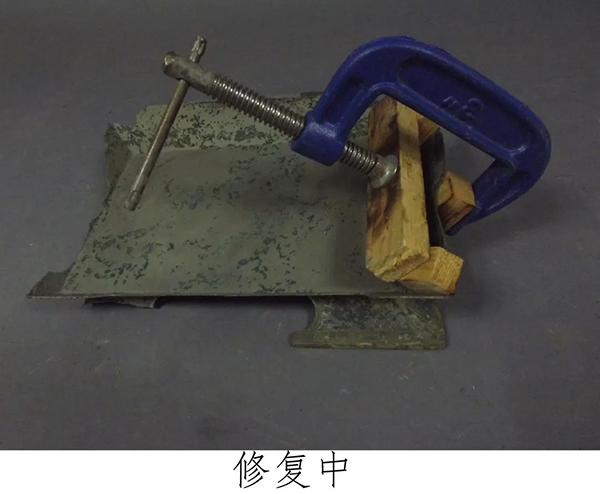 由于簠从底面、盖面及斜壁的折角处断裂、变形,破碎成长条,需采用C型钳工具及自制特殊工具对器物变形部位进行矫形。在矫形时把两块自制木块放在器物变形处两端及适当位置,两木头上放一横梁,构成一个支架,用C型钳夹住器物中间和支架中间。用热风枪加热变形位置,消减青铜内部金属分子自身应力,增加铜质的可塑性。由于此簠腐蚀,铜质减少,矫形时更加小心,慢慢旋紧螺杆,循序渐进,利用夹合力矫形到位,直至不再反弹为止。