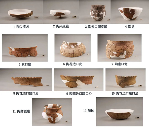 东周时期遗迹数量较多,集中分布于遗址东南部,为该遗址的主体文化遗存。共清理房址3座、灰坑8个、柱洞8个。房址分两层分布,第7层界面上发现房址2座,第8层界面上发现房址1座,以分布于第8层界面上的F4为例。F4保存状况较差,存留有柱洞6个,根据柱洞的分布推测,房址平面可能为长方形,坐东北朝西南,长约9.6、残宽4.25米。房址地面分布有大量陶器碎片,共提取可复原器及器物标本54件,包括花边口沿罐、盆、尖底盏、高领罐、高领壶等。灰坑多数叠压于第7层下,少量叠压于第8层下,平面形状以圆形和椭圆形为主,仅个别为长方形。灰坑边壁多数较规整,绝大多数坑内未出土遗物。