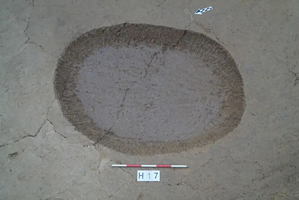 新石器时代遗迹发现较少,仅发掘灰坑1个、灰沟1条和柱洞6个。H17叠压于⑨层下,平面呈椭圆形,边缘形态不明显,剖面为弧形圜底,底部较规整。口部长径1.16米、短径1.08米,深0~0.19米。坑内堆积仅1层,灰黄色粉沙土,结构致密,包含少量红烧土颗粒、零星木炭,出土夹细砂卷沿深腹罐1件。