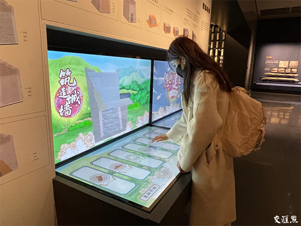 一进入南京城墙博物馆,记者感受到的是一股扑面而来的现代感与艺术感。博物馆的整体设计跳脱出人们以往的印象,采用了极简的风格。展厅中充分利用现代数字技术,用电子屏幕实现了与参观者的深度链接。像城墙是如何一块块垒成的、砖块背后的历史文化及遗产价值等知识都以小游戏、互动短片等形式生动地传递给了参观者。大型明代南京城全景数字沙盘配合每15分钟一场的影片,砖窑透明展示柜实景还原六百多年前的烧砖现场,通过虚拟技术带领观众穿越,创造极具参与感与真实感的参观体验,打破传统意义上以展示和讲解为主的参观方式。