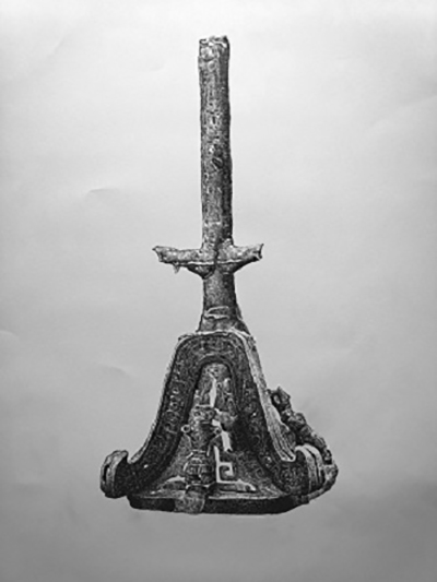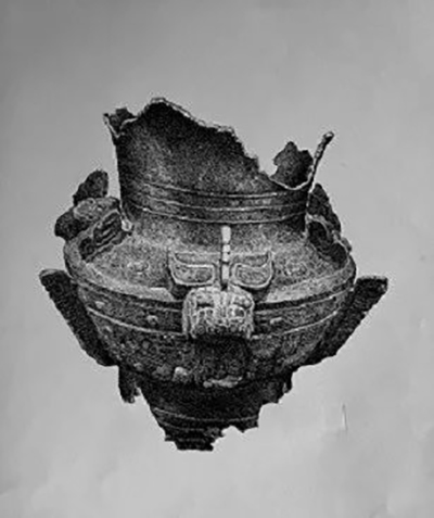 那张“青铜面兽”是一件让人过目不忘的艺术珍品。它把一只类似于老虎的面部,与两组很具有三星堆文物特征的回形图案结合起来,用夸张的手法将动物的两只前腿作为整个兽面的下面部分,达到稳定平衡的作用。整个画面不但线条流畅,曲直交织,线面结合,稳定而又富有动态之美,而且很具有现代审美意义。