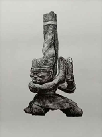 那尊青铜顶尊跪坐人像,就是表现的一个十来岁少女在某一个场合下,在完成着一个很神秘的“工作”的雕像。这尊雕像由两部分构成,下面底座是一个倒扣着的,有点像喇叭花一样的器具,镂空里面雕刻的好像是火焰在燃烧。上面的底座上跪坐着一个十多岁的少女,她上身裸露,皮肤细滑,胸部突出。下身着一件超短裙,腰间束带系了蝴蝶结。看到她,使人想到了尼泊尔的活女神。这尊古蜀国的女神,双手向上托举,头顶一个带盖的铜尊,向天神献祭。