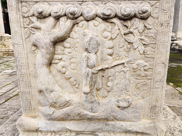 “机灵鬼儿”在东碑林、香炉附近,这是一块清代顺治皇帝题写的《重建东岳庙金灯碑记》,碑座两侧各雕有一位提着灯笼的小道童。民间传说,小道童经常在晚上化为人形,提着灯笼出庙玩耍,在附近的小摊讨糖果吃。