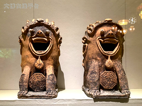 风狮又称风狮爷、石狮爷、石狮公,是闽南、金门、琉球群岛等地设立在建筑物的门、屋顶或村落的高台等处的狮子像,用来替人、家宅、村落镇风辟邪。其造型推测是由庙宇门口的石狮形象演变而来,狮子为百兽之王,狮子的形象常被用于辟邪招福。此构件来自福建金门地区传统建筑,为大门前的陶灯座。