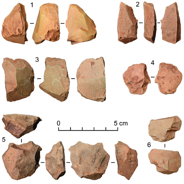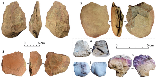 迪庆州调查以香格里拉市区周边和小中甸镇为重点,这些区域的地形相对开阔,能够为古人类活动提供良好的空间和生存资源。调查共发现30余处旧石器地点,部分地点采集的石制品较为丰富。根据石制品的技术与形态特征,可将这些地点大致分为两类。一类以细小型的石制品为特色,原料主要采用脉石英、燧石等质地细腻的硅质原料,工具类型中出现楔形析器等特殊类型,可能对应某种特定的技术适应方式和使用功能(图3:4-6);一类以大型手斧类工具为特色,原料主要采用尺寸较大的砂岩和各种变质岩,整体表现出某些阿舍利技术的因素(图3:1-3)。