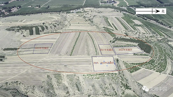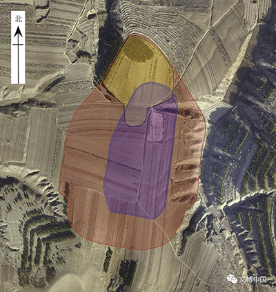 祭祀区 整体是一处经过两次精心规划设计与营建的祭祀场所。第一次的建设,是依托北部一座小山头,对东、西、北三面山坡进行修整,形成三层“梯田”形的祭祀场所,第三阶梯形制最为规整,平面为长方形,方向与山脊同向,为北偏东14度,南北长约180、东西宽约60米。第一、二阶梯形制不规整,仅西边缘为直墙,二者近平行,方向为北偏东24度,西南、西北转角均保存完好。第二次的建设,是在第一次营建的祭祀区南部进行垫土,也是山梁鞍脊最低处,在该处经三次堆积成一座大型垫土台,使得鞍脊与南北两侧山脊相平齐,形成一个便于活动的大平台,进而形成一个新的祭祀场所,该垫土台平面近长方形,南部长约80、东西宽约60米。根据T0357北壁堆积情况可知,土台垫土堆积可分为三层,第一层为黑褐色土堆积,厚约0.6米,第二层为黄褐色土堆积,厚约0.5米,第三层堆积为白黄色土堆积,厚约0.4米。